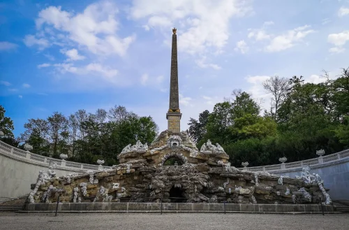 The Obelisk Fountain combines architectural ambition with symbolism. The towering obelisk, decorated with hieroglyph-like inscriptions, was intended to showcase imperial power and the dynasty’s connection to ancient civilizations.